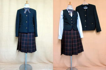 制服:制服のデザインは、VANジャケットで一世を風靡した石津謙介氏です。コンセプトは、知的で爽やかな英国トラッド。季節に応じて様々な着こなしの組み合わせが楽しめます。紺色ジャケットにタータンチェックのスカート、ストライプのリボンを身につけます。公式制服紹介ページ・高校 中学校 |